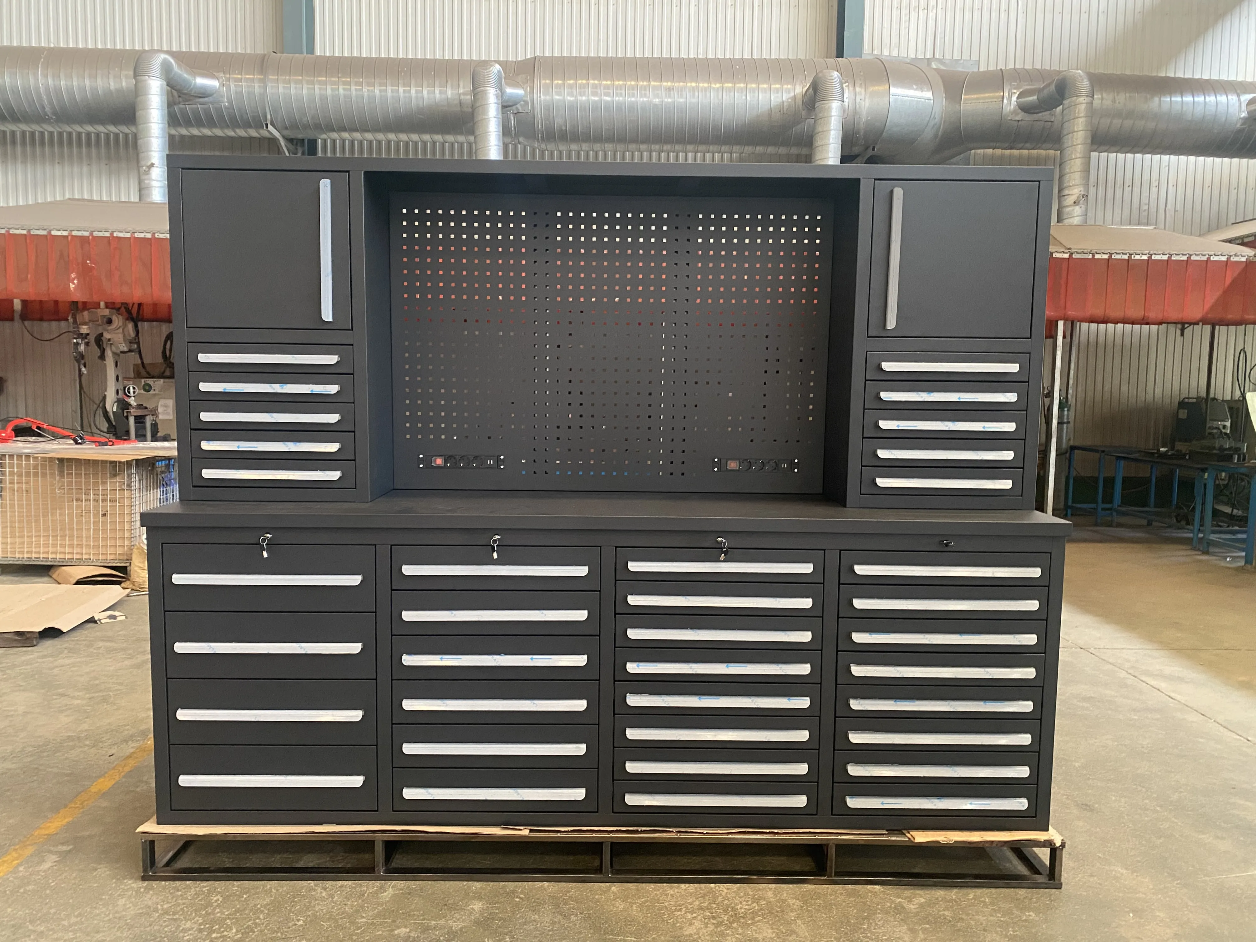 Tá na caibinéid uirlisí seo déanta as plátaí cruach fuar-rollta ardcháilíochta, ag cinntiú daingne agus cobhsaíochta. Tá na tarraiceán crafáilte ó phlátaí cruach galbhánaithe, ag soláthar airíonna frith-chreimthe agus frith-rust den scoth. Laistigh, tá 36 tarraiceán, ag tairiscint go leor spáis stórála le haghaidh uirlisí agus codanna de mhéideanna éagsúla.